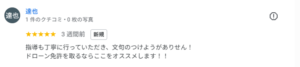 「指導も丁寧に行っていただき、文句のつけようがありません!ドローン免許を取るならここをオススメします!!」